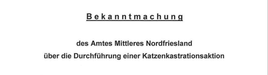 Aufgrund einer bereits erhöhten Population von Wildkatzen an einem Hot-Spot in Vollstedt wird das Amt Mittleres Nordfriesland in Zusammenarbeit mit dem Tierheim Ahrenshöft vom Tierschutzverein Nordfriesland e.V. in diesem Bereich eine Kastration von Wildkatzen durchführen. Im Rahmen der Kastration werden die wildlebenden Katzen auch mit einem Chip gekennzeichnet. Die Aktion wird im Zeitraum von 17.02. - 28.02.2025 durchgeführt.